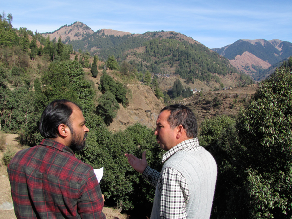 Ashwini Chhatre chats with an NGO worker in Himachal Pradesh, while working on the motivation project. Preliminary findings suggest that if a person receives only private goods (a chicken, a goat, for example) or information, they often shift from environmental to economic motivations. Therefore, once a project withdraws, the original intrinsic motivation to save forest that many people have naturally has been removed. Photo credit: Pushpendra Rana