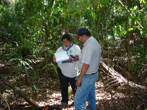 At each IFRI study site, the scientists establish plots where they collect data on forest conditions. "To determine where we will do our forest plots, we take a map of the community forest and overlay a grid on it," explains Emily Etue, Assistant Program Officer for The Center for People in Forests in Bangkok, a nonprofit organization using IFRI data collection to set up long-term monitoring and evaluation sites in several southeast Asian countries. "Using a random numbers table we choose 30 plots that fall within the community forest area."