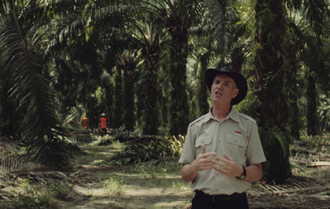 John Hartman, a manager at Cargill, explains how important discipline and routine is within the workforce. Hartman explains the importance of sustainability. Behind him is the industrial oil palm monoculture where rainforest once stood.