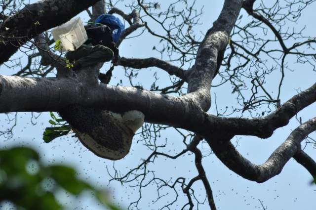 From this description, it should be clear that the commonly practised traditional method doesn’t place much importance on hygiene and sustainability, which affects the honey quality and continuity of the honey bee habitat. In contrast with the traditional technique, sustainable and hygienic honey-production emphasizes preserving the honey bee and its habitat and the post-harvesting process takes cleanliness into account. In this method, preserving the bee is ensured through conserving trees; not only those that harbour hives but also the surrounding trees because they provide protection and are food sources.