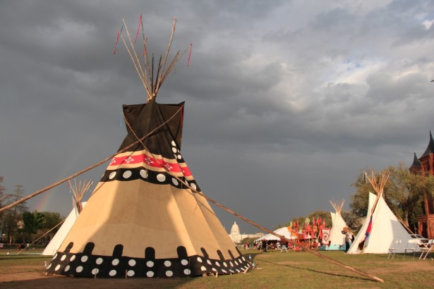 As the sun set on the first evening of the Washington, D.C. gathering, folks sat under a white tent, eating dinner on paper plates and taking refuge from the tourists who swarm the camp, saying, “Look! Real Indians!”