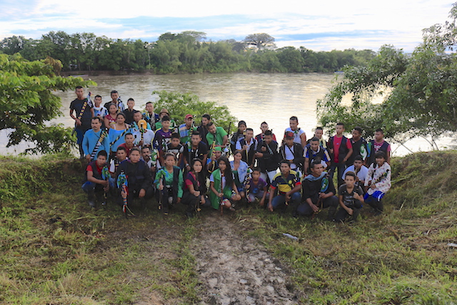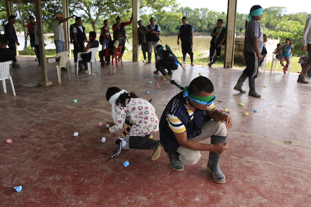Fijamos unos días a principios de junio de 2017 para hacer un trabajo aportando a la formación de las guardias indígenas de los resguardos de Buenavista y Piñuna Blanco. Vinieron unos 40 jóvenes de las dos guardias para los tres días de trabajo, donde enfocamos en el tema de comunicación. Nuestro propósito era facilitar un espacio donde la guardia pudiera tomar aprendizajes y herramientas de afuera, aplicándolas a su realidad para fortalecer la defensa de su territorio.
