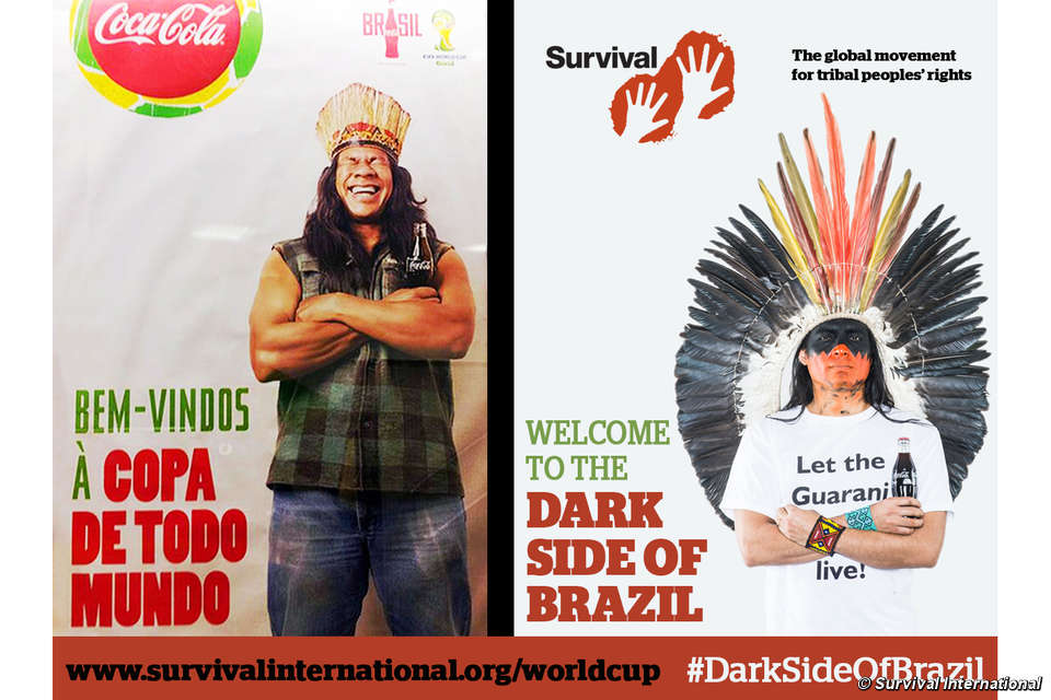 Para llamar la atención sobre la profunda ironía que supone que Coca-Cola y la FIFA promuevan el Mundial con la imagen de un hombre indígena feliz al que acompaña el mensaje “Bienvenidos a la Copa de todo el Mundo”, Survival ha recreado un anuncio alternativo a modo de parodia que muestra al indígena amazónico Nixiwaka Yawanawá dando la bienvenida al público a “El lado oscuro de Brasil” y reclamando que “Dejen vivir a los guaraníes”.