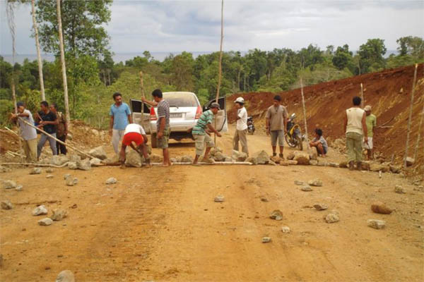 Masyarakat adat aksi meblokade jalan yang dibuat perusahaan di lahan adat. Semoga kehadiran UU Desa bisa menguatkan keberadaan desa-desa yang terancam investasi ini. Foto: AMAN Maluku Utara