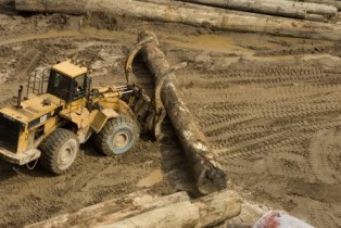 Di tepi kanal galian PT SRL, dari jarak sekira 300 meter satu alat berat sedang menumpuk kayu di tepi kanal. Kami mendekati alat berat itu untuk memotret sambil melihat sekeliling: tanah-tanah berlubang bekas kayu dicabut, pohon dan kayu tergeletak, rumput mulai bertumbuhan, tanah gambut terbuka dan tersisa pohon ramin tinggi menjulang tinggi belum ditebang, ironisnya ada bekas kayu terbakar dalam areal PT SRL.